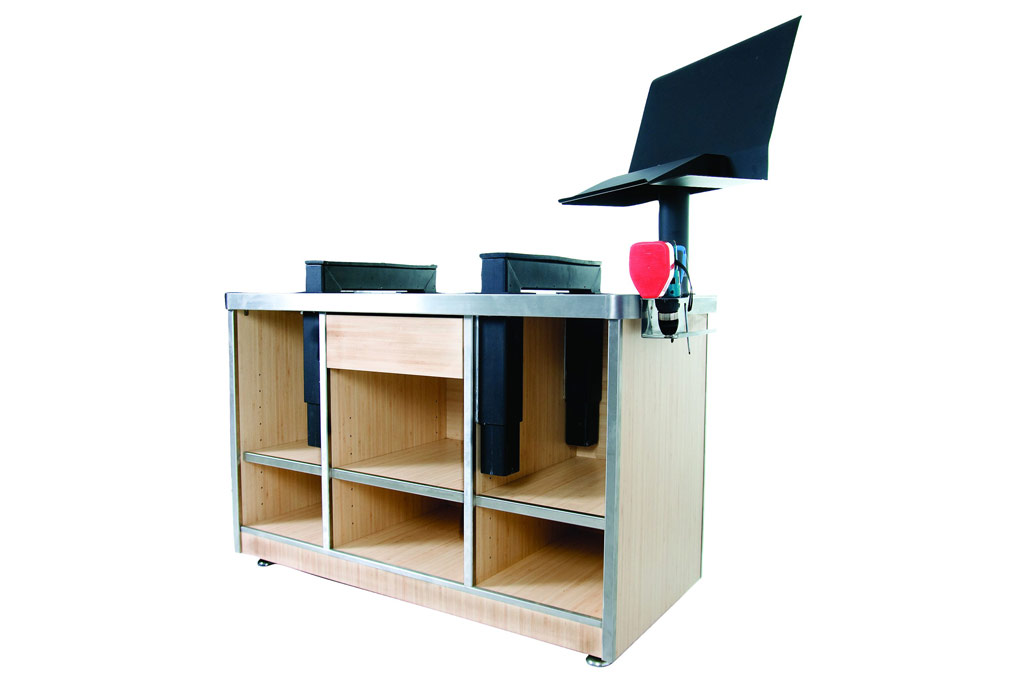 Neccessary addition is rotable shelf for computer, keyboard, card reader and printer. The table is devided in 3 parts allowing to have drawer and shelfs. New is shlef for tools.