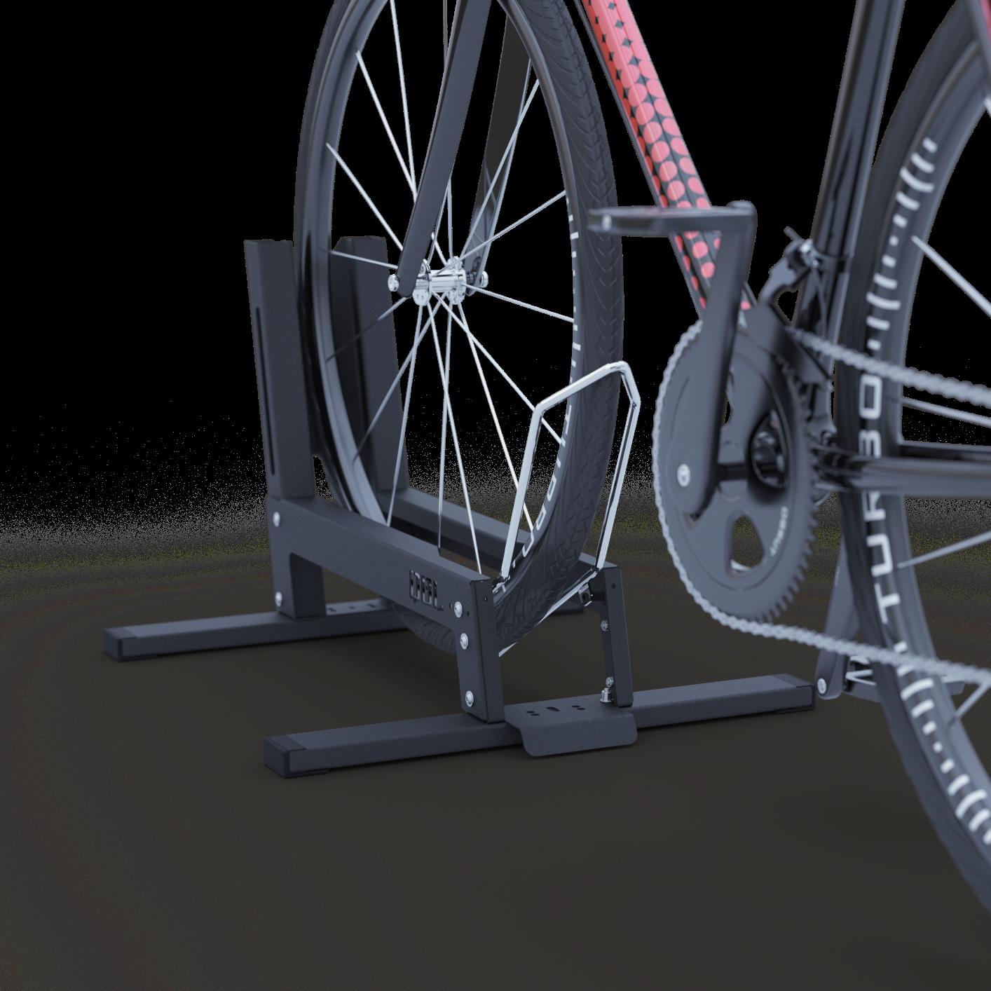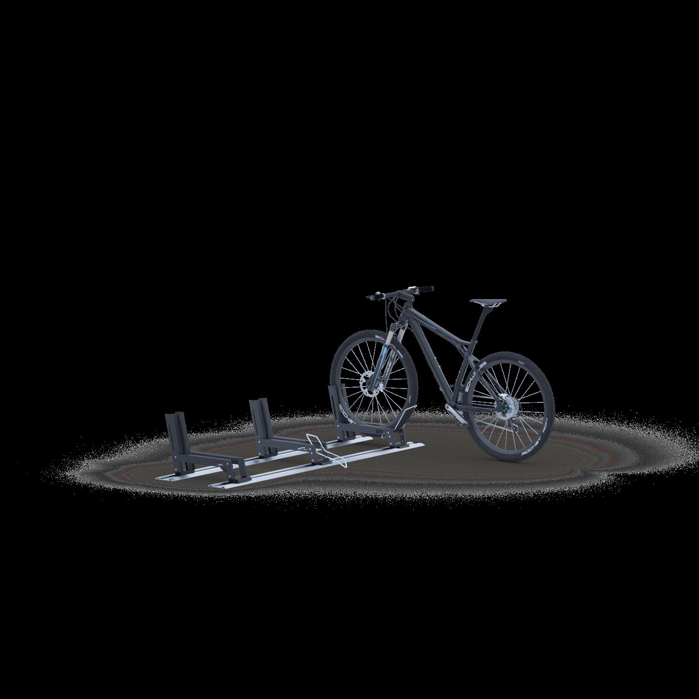 Je možno dodat i provedení s ramenem pro ještě větší stabilitu kola. Další možností je upevnění stojanů do pojezdové kolejnice a stojany tak jsou v jedné řadě a je možné je i v kolejnici posouvat.